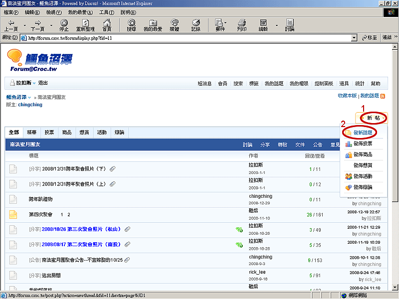 進入欲發文的版面,將滑鼠移至頁面右上角的「新帖」按鈕 (1),待下拉式選單出現後,點選「發新話題」(2)。