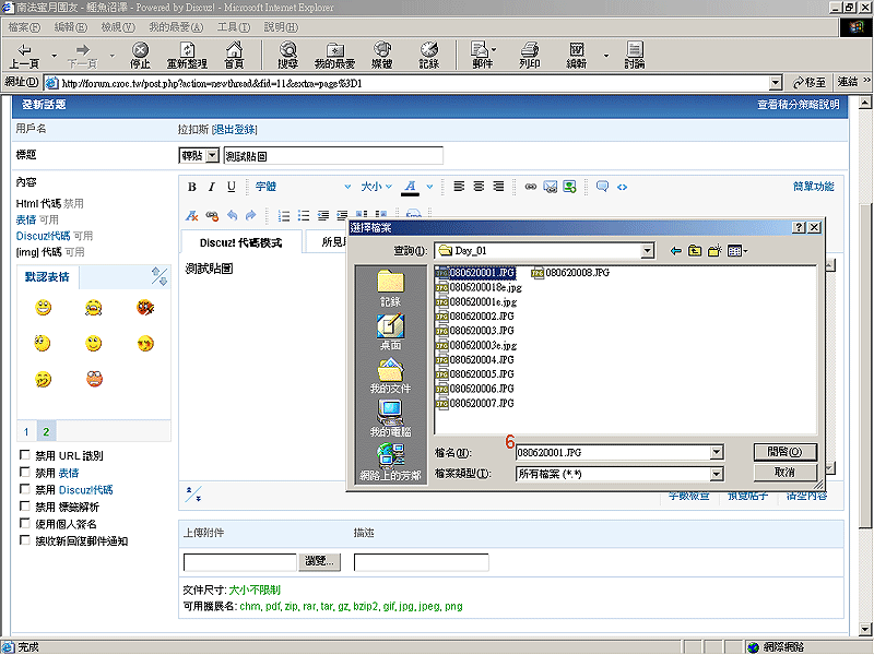 在選擇檔案對話窗中選擇欲上傳的檔案或圖片後按「開啟」(6)。