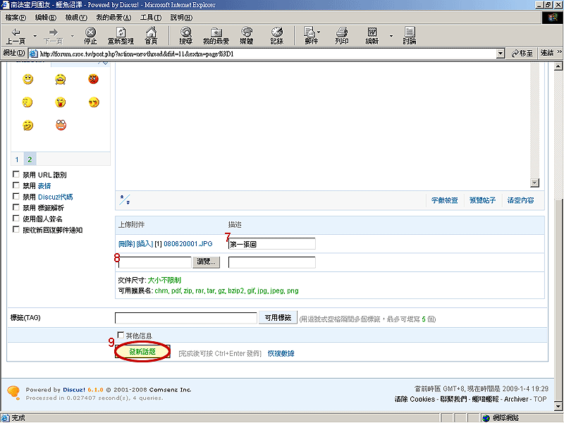 回到新帖頁面,您可以在「描述」欄位中填入簡短的圖說 (7),或是點選下一列的「瀏覽」按鈕選擇下一個要上傳的檔案或圖片 (8)。您可重複前述動作直到達到版面上傳上限或是適當數量後點選「發新話題」按鈕 (9)。