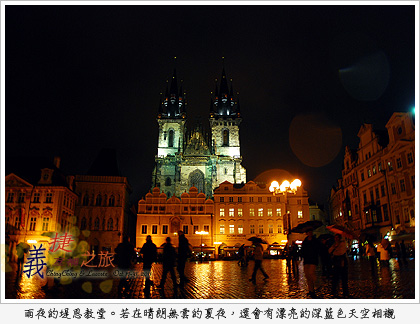 我前一次來,是晴朗無雲的夏夜,由於夏天天黑的晚,加上天氣絕佳,泛著深藍色的天空襯在亮燈的提恩教堂之後,景色非常漂亮。 這一次雖然天氣差了一點,天空也很快的就黑成一片,不過雙塔造型的提恩教堂,在入夜點燈後依然頗有夢幻的感覺,值得帶個腳架來好好拍上幾張! 雨,還是在下,我回頭安慰老婆,雨下多天就開了。但我想以飛機上看到那片厚到幾乎可以當成跑道降落的雲層,如果不來陣雨點比眼珠子還大的暴雨,應該拿火焰公主的芭蕉扇都搧不開吧! 不管啦,還是騙一下自己明天會更好吧! 2011義捷互補之旅索引(暫訂)