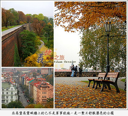 高堡位於布拉格的新城區,距離舊城中心不過幾站捷運的距離。由於舊城的景點都是靠雙腳就可抵達,加上新舊城區很明顯的一個是觀光區,一個是住民地,人潮和住民的英文程度截然不同,從舊城來到這裡,竟頗有換了一座城的感覺。 比起布拉格城堡,高堡的名氣顯然小得多,但就歷史而言,它比布拉格城堡還要更久。不同於布拉格城堡被層層建築圍繞,從遠方看根本分不出哪裡是城牆;在高堡周邊,遠遠的就可以看到綿延的城牆,或許整體外觀不像布拉格城堡那麼漂亮,但因為可以直接看到城牆的高聳,氣勢並不在布拉格城堡之下。 城牆內,知名的景點有葬著德弗札克等名人(不好意思,小弟聽過的就只有這一位)的名人墓園、堡內最顯眼的建築聖保羅聖彼得教堂、看起來像個小碉堡,其實是布拉格第一座教堂的聖馬汀教堂等,另外還有漂亮而廣闊的綠(林)地和居高臨下的絕佳視野,即便沒有舊城區密集而漂亮的建築群,但卻是個更適合悠閒度假的好地方。 令人意外的是,這麼可愛而有歷史的地方,在我六年前隨身帶來的中文旅遊書竟沒有一本有提到這裡!我們當年之所以會進入高堡,還是在逛新城區時,跟著布拉格隨處可見的景點標示,在「不知道那是什麼地方」、「好像不太遠,那走走看好了」的情況下,誤打誤撞找到的,其間一度因為「不知道走到最後會不會是個爛地方」而差點打退堂鼓。還好當年我們有的是「腳力」和「冒險犯難」的精神,才沒有錯過這個被旅遊書忽略的好地方! 如果你是那種喜歡在漂亮的地方輕鬆散步,更勝在人擠人的超級景點趕場的人,強力推薦,來布拉格,一定要留時間給高堡! ![]() 我們沒迷路,只是鬼打牆……