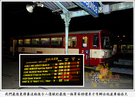 跟其他歐洲國家相比,捷克的火車運輸是相對老舊而龜速。我們的列車掛的是每包廂六個人的包廂式車廂,這麼晚了在異國搭車,這種車反而令人擔心,因為不知道坐一起的是什麼人,一旦睡著了,出什麼事也沒人看到,因此雖然有隔間,卻反比一般大通舖型的車廂更恐怖。不過我們運氣還算不錯,今天似乎是這邊大學生返校(鄉)的日子,車上大部分人都是學生,同包廂的學生有男有女,彼此互不認識,有的看書、有的看筆電(還是華碩的),其中一位在我們跟不懂英文的查票人員雞同鴨講時,還主動幫我們溝通,這讓我們又再放鬆了一些。 我跟老婆說,我會醒著,要她先睡一下,但我想她應該睡不著吧! 布達札維‧服務人員走光光的火車站